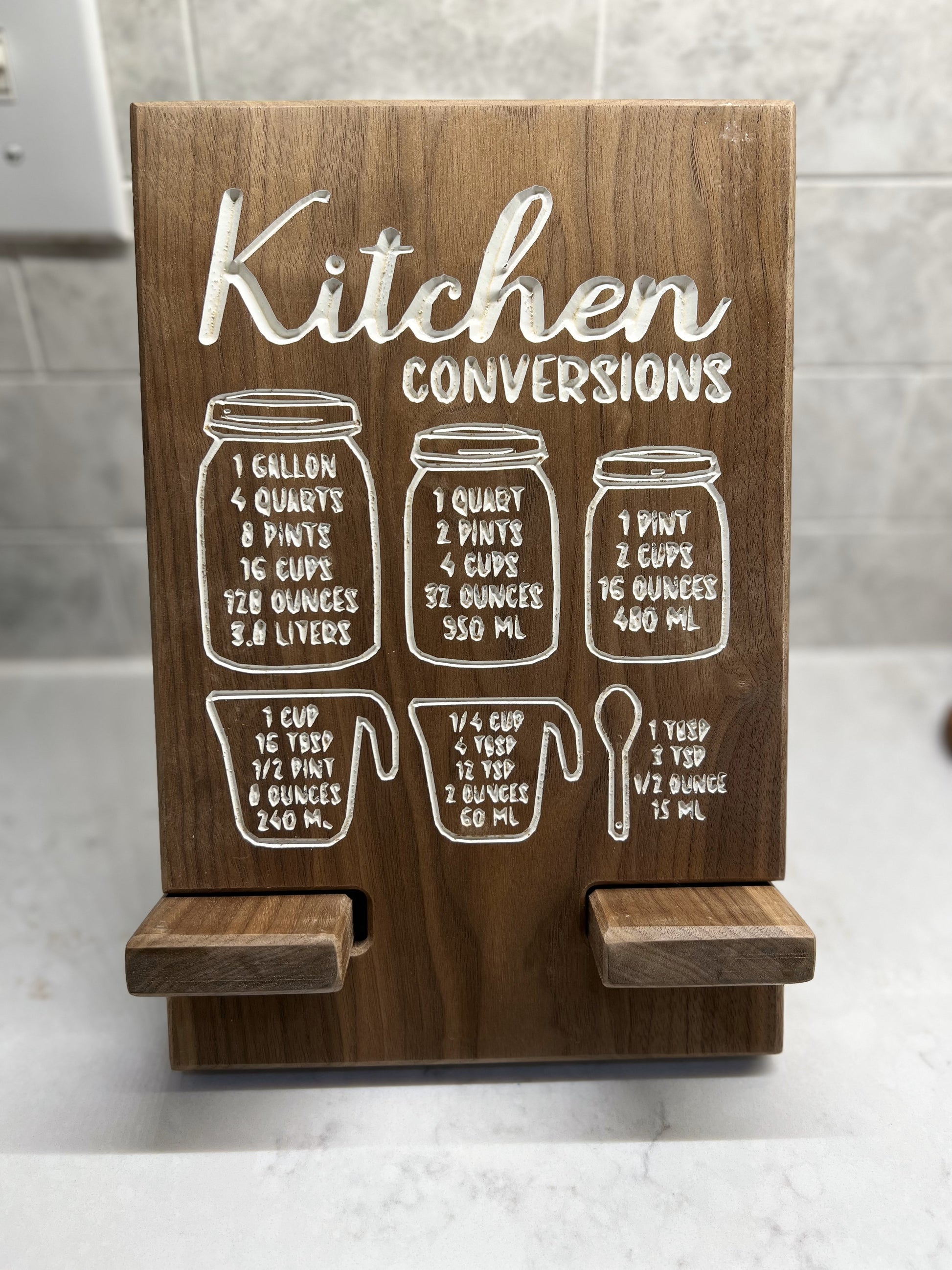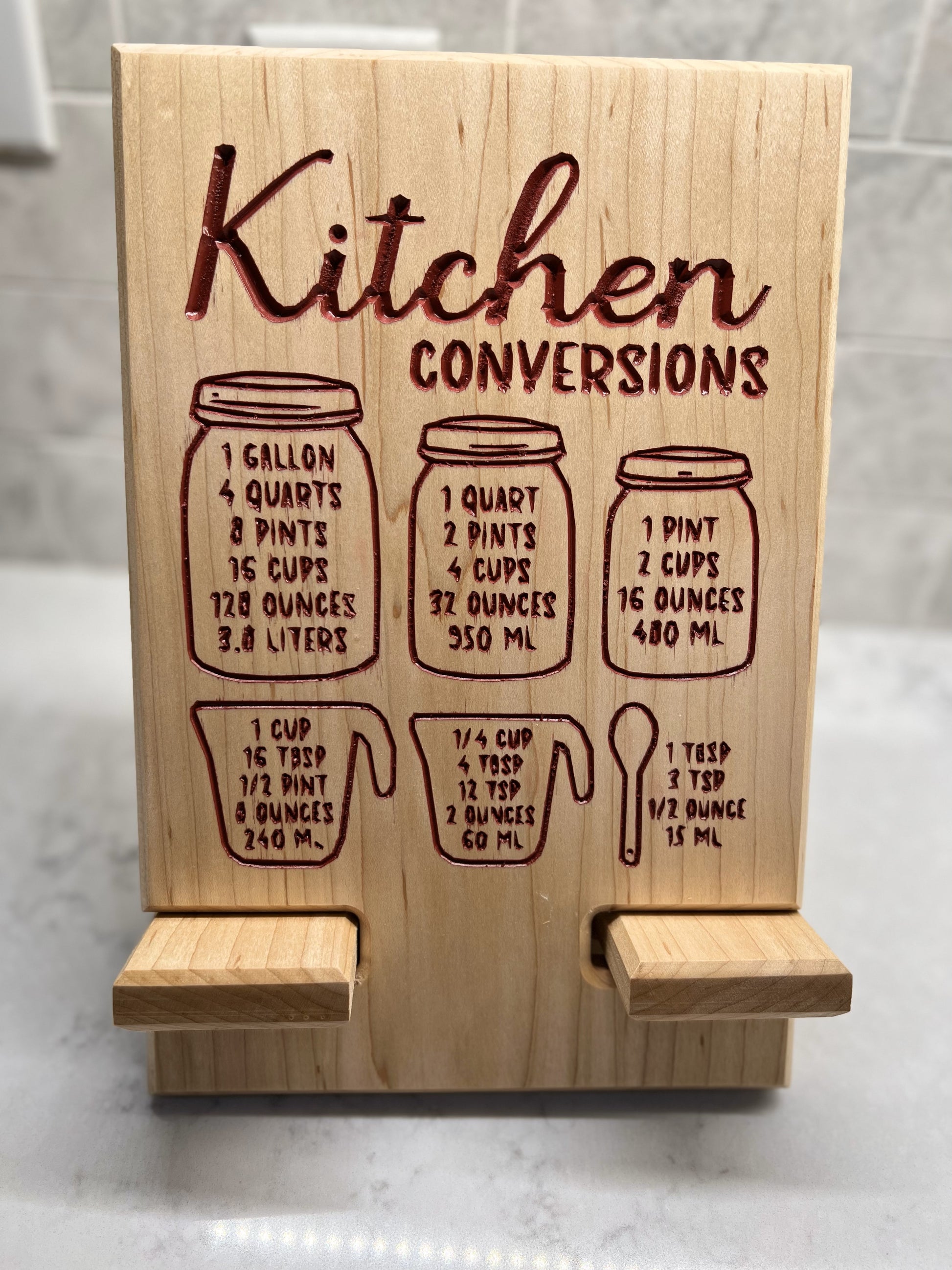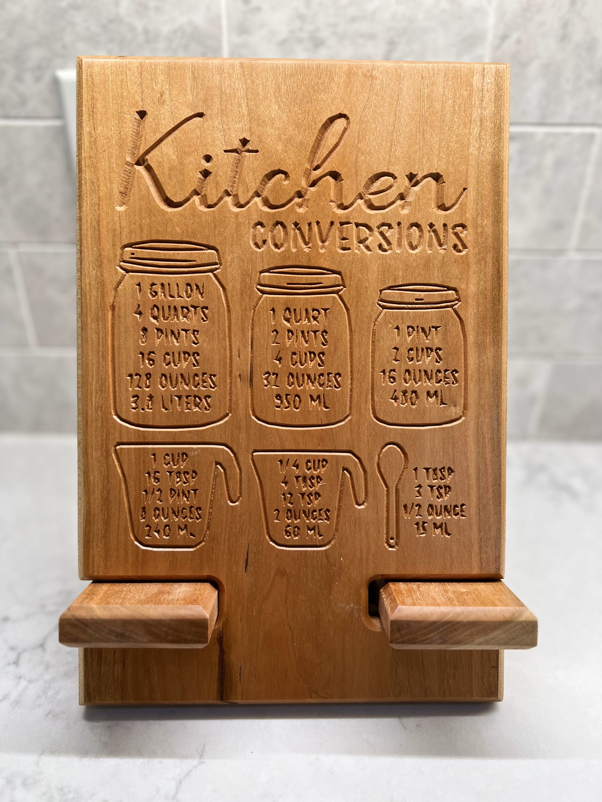 Streamline your kitchen with our versatile Tablet Holder. Access quick measurement conversions and easily store your devices or cookbooks. The organized design includes space on the bottom shelf for power cords. Perfect for any home chef looking to stay organized and efficient in the kitchen.