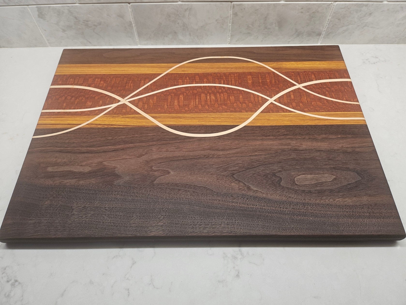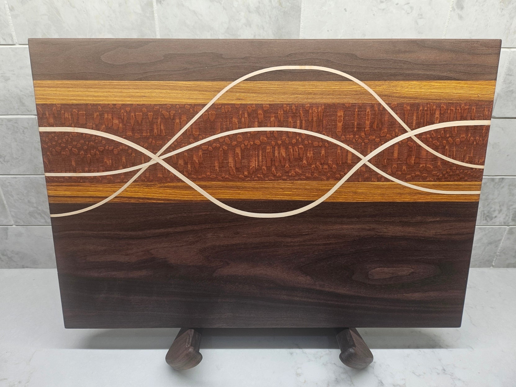 The Serengeti cutting board showcases a sophisticated blend of exotic woods—leopard wood, canary wood, walnut, and delicate ribbons of maple—creating a striking and elegant design. Measuring 12" by 18" with a thickness of 0.75", it offers both beauty and durability, making it a refined addition to any kitchen.