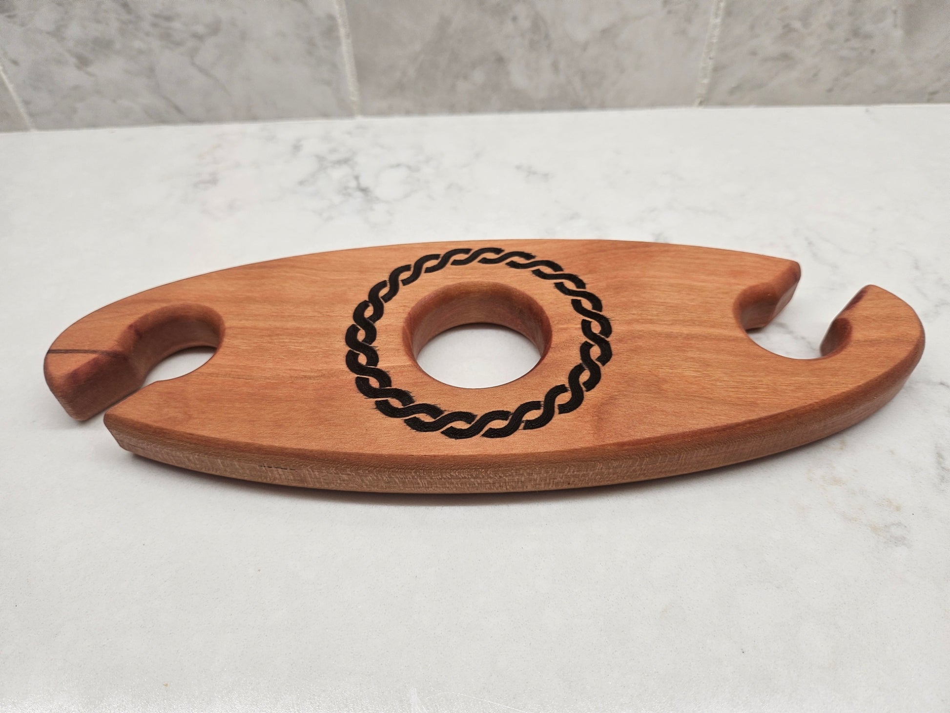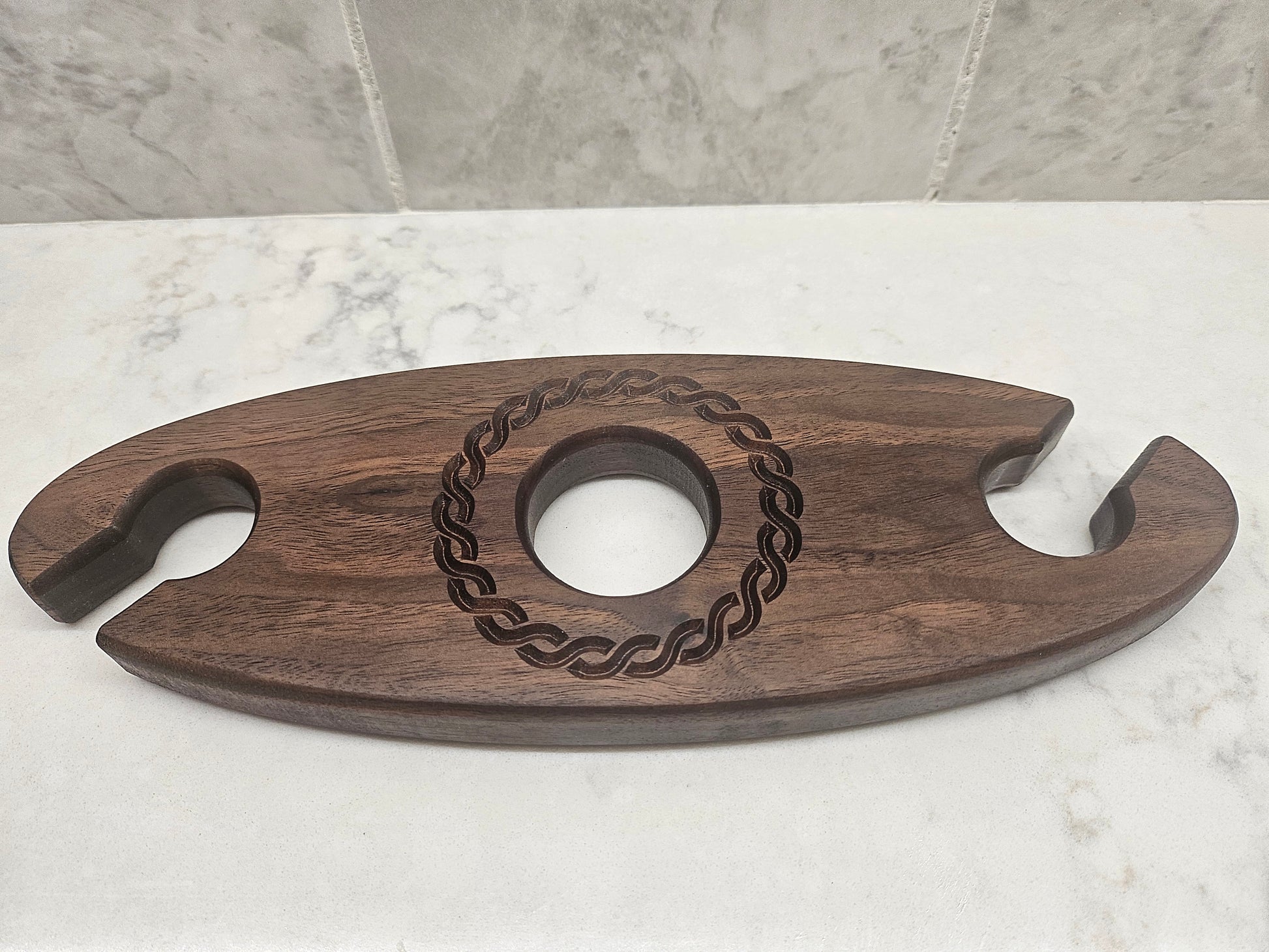 The Wine Caddy is expertly crafted from walnut, making it a durable and stylish choice for carrying your favorite bottle of wine and two glasses. Its sleek design fits a standard wine bottle and glasses, providing the perfect solution for picnics, outdoor events, and entertaining. Enjoy the convenience and elegance of the Wine Caddy.